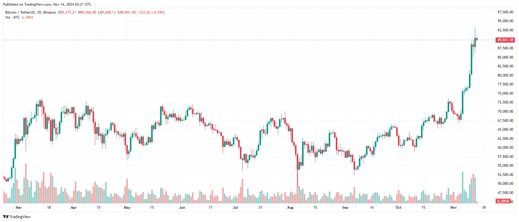For instance, following the 2016 halving, Bitcoin’s price escalated dramatically, culminating in its infamous December 2017 high of nearly $20,000. A similar pattern was observed post-2020 halving, where Bitcoin soared to its previous peak of $69,000 in November 2021. These historical trends suggest that Bitcoin’s current rally past $90,000 could be part of this established cycle.